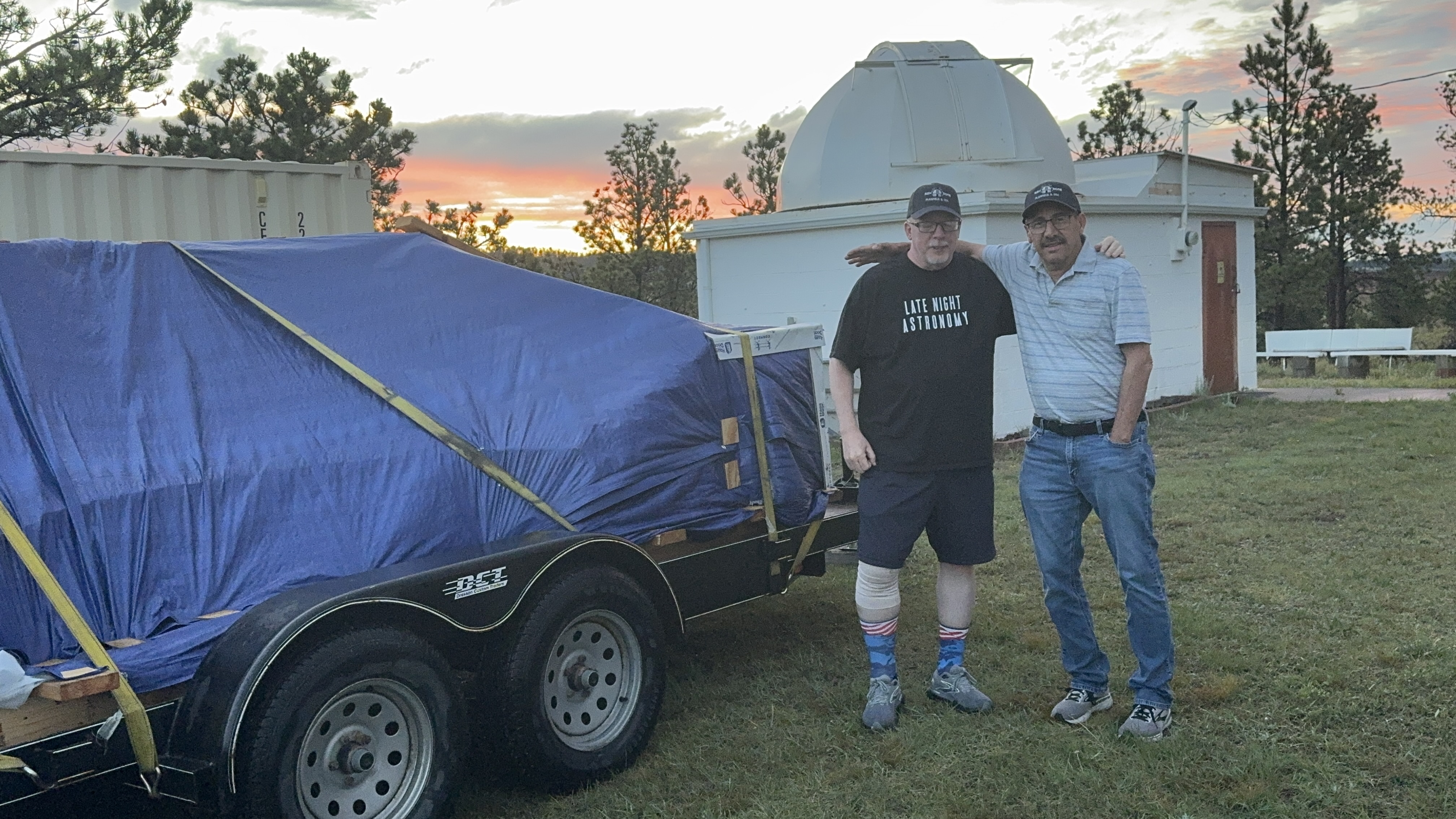 June – The new dome is ready for pickup! Rick, Observatory Director, and Kip, Deputy Observatory Director, pull a trailer to Plainfield, IL, to transport the completed dome from Ash Dome manufacturing to Rapid City.
