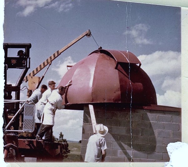Pictured here, members Clark Johnson and Ed McBride assist employees of Rapid Tank, Inc with Byron Painter on the ground, to maneuver the dome into position. Members Bill Lehmann and Ron Dyvig are standing on ladders inside the observatory. The dome is coated with a red primer.
